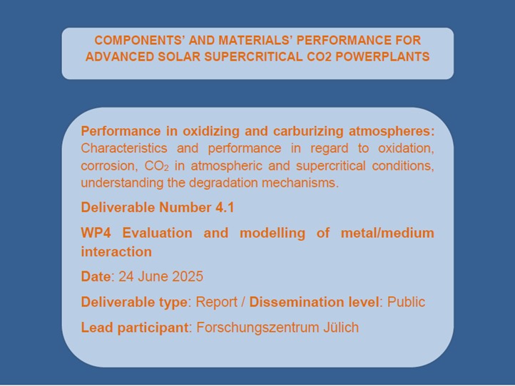 The investigations of oxidation and corrosion resistance were carried out in a test programme shared between FZJ, CIEMAT and CVR. The specimens were tested in air or CO2 (technical or high-purity gas) at elevated temperatures (between 600°C and 900°C). The materials were characterised in thermogravimetry experiments (FZJ), quasi-isothermal oxidation (CIEMAT), and cyclic oxidation (FZJ), with future high pressure autoclave (CVR) tests planned. In order to evaluate the oxide scale growth kinetics and the microstructural changes in the materials induced by oxidation/corrosion, post-exposure characterisation was performed mainly by optical metallography and SEM/EDS analysis of cross-sections of the specimens. The deliverable D 4.1 provides a comprehensive overview of the oxidation and CO2-corrosion testing results.