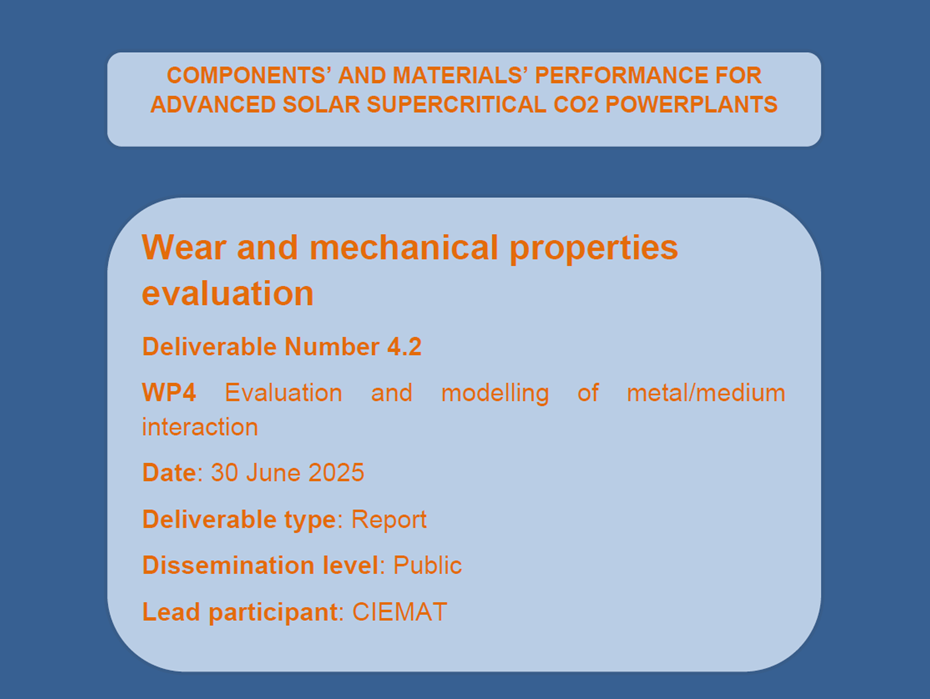 This report includes the experimental work and results obtained in the Task 4.1 regarding to the external wall investigation of the structural material and its interaction with the particles. The laboratory investigations, wear and creep tests and aim to understand the degradation mechanisms of these materials, in order to assess their performance. The main degradation expected is related to oxidation and corrosion protection, mechanical properties and wear. These properties have been studied with the State Of The Art (SOTA) materials and particles, used as reference, and the new particles developed in WP2 and the new bulk materials and coating developed in WP3. The laboratory tests are carried out under conditions simulating actual plant conditions. The degradation mechanisms of the materials are analysed in order to predict the lifetimes of the materials (heat carrier particles and heat exchanger components). The deliverable D 4.2 provides a comprehensive overview of the wear and mechanical properties testing results.